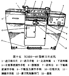 帶刀片幫機主要由帶刀機構、送料機構、磨刀機構、傳動機構和集塵裝置等部份組成。