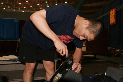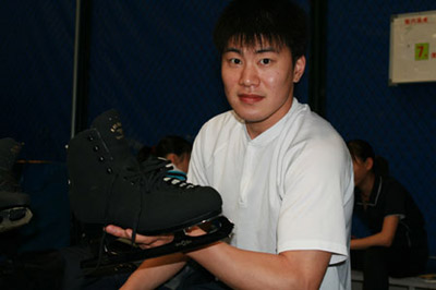 同樣受新鞋困擾的還有男單名將李成江,記者與陳曉飛、張昊師徒聊天時,已經結束訓練的他正拿著工具調試新冰鞋上面的鏍絲,“我這雙鞋也是新換的,看,鏍絲還沒上全呢。這雙鞋大小倒還可以,就是鞋面太硬,現在我的腳上磨的全是血泡!每天訓練都得咬著牙上場。”