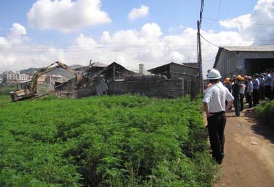 占地數百平方米,簡易搭蓋的皮革小作坊,不到20分鐘全部倒下。昨日,晉江市環保、公安、行政執法、工商、水電等部門及安海鎮政府組成300人聯合執法組,強制拆除晉江安海可慕村5家皮革小作坊,并對這些小作坊斷電斷水,拆除設備,防止回潮。