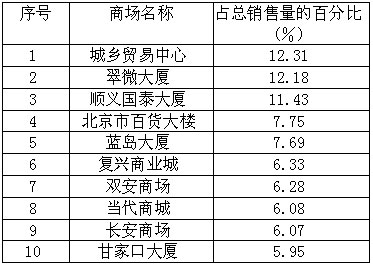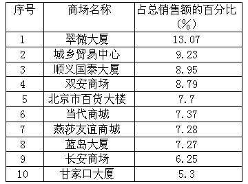 排名女鞋銷售額前十名商場的女鞋銷售額約占總額的81%。翠微大廈、城鄉貿易中心、順義國泰依舊占據前三甲席位。