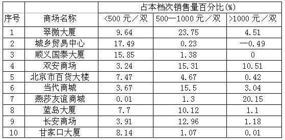 從2007年4月女鞋銷售額前10位商場的檔次分布看,翠微大廈依然是個檔次女鞋銷售全面開花,城鄉貿易中心、順義國泰大廈還是突出中低價位女鞋銷售。