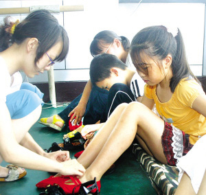 7月3日下午,永寧小學五年級四班學生唐倩倩和其他4名特困職工子女第一次穿上紅舞鞋。