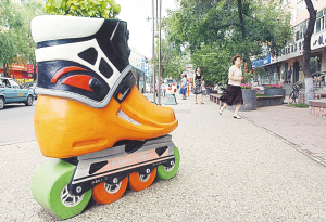 近日,為營造體育街的運動氛圍,哈爾濱市在南崗區體育街沿街設置了各種體育主題雕塑花壇,成為冰城一道別樣的風景。圖為哈爾濱市南崗區體育街上的雕塑花壇“旱冰鞋”。