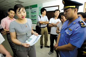 在戴希曼鞋城,北京戴希曼公司一名女負責人在接受工商人員的調查