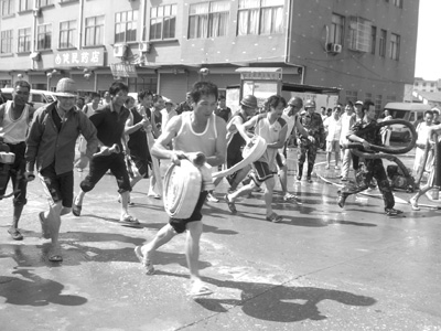 7月4日,是直埠鎮姚公埠一年一度的傳統節日——水龍節。每年農歷五月廿十舉辦的水龍節,對姚公埠人來說,意義非同尋常。它既是一次消防演練,也是一次可與云南西雙版納傣族“潑水節”相媲美的傳統文體活動。當天,盡管驕陽似火,酷熱難當,但前來參加水龍節的全鎮11支義務消防隊,都全副武裝早早來到姚公埠護村河邊待命。前來觀戰的人群把護村河兩岸,擠成黑壓壓的一片。