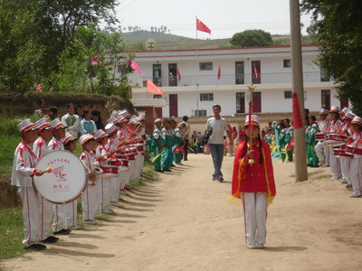 孩子穿上校服敲鑼打鼓在校門口迎接