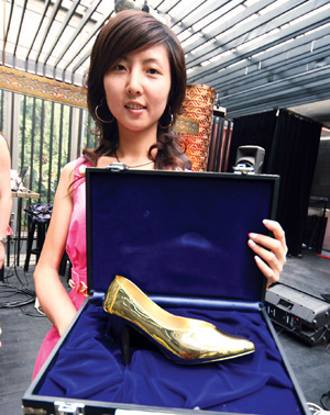 8月2日,在杭州的一場新款珠寶發布會上,一只用純金打造的黃金鞋亮相。據介紹,這只黃金鞋價值25萬元。圖為一位女士在展示黃金鞋。