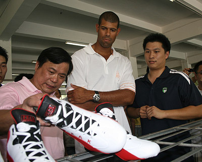 流火七月,驕陽把南方烤的像火爐一般,萬物似乎都蟄伏了,然而匹克卻因其代言人--休斯敦火箭隊巴蒂爾的到來,四處洋溢著喜慶,每個人臉上都展現快樂的笑容。13日下午,巴蒂爾在福建匹克集團董事長許景南、副總許志華的陪同下參觀匹克總部,這也是此次巴蒂爾來華繼北京、廣州后的又一站。