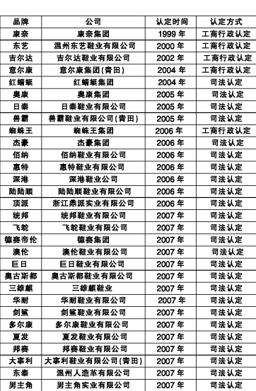 1999年,康奈通過工商行政認定,成為溫州鞋的第一枚中國馳名商標。從1999年到去年年底的8年時間里,有15個溫州鞋品牌成為馳名商標。年均獲得的馳名商標不到2枚。記者從工商部門獲悉,截至昨日,今年短短7個多月時間,溫州鞋革行業就增加了15枚馳名商標;而且都是通過司法程序認定的。