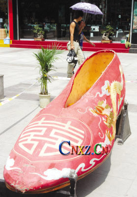 據了解,此次鞋文化巡展主要通過古鞋、圖片靜態展示與模特表演相結合,其中更多融入娛樂、藝術、互動等節目,此次共展出100余雙遠古到民間各時期有代表的鞋履,其中有清朝的三寸金蓮、唐朝的宮廷鞋、紅軍的草鞋、江南的繡鞋、各具民族特色的少數民族鞋履等8大系列,還有鞋與歷史、鞋與文化、鞋與傳說。在展臺前記者看到,市民在觀看古人所穿的各式鞋履后對其精湛的做工嘖嘖稱贊。在展柜中,有五代李后主令寞娘用帛纏足,使腳纖小彎曲如新月狀,并在六寸金制蓮花臺上跳舞的“三寸金蓮”;有清朝康熙后妃的“花盆底鞋”,該鞋底用木頭做成,外裹白布,上寬下窄,一般為7厘米左右,最高可達12厘米,連慈禧太后也穿此鞋。而最引人注目的則是目前世界上最大的繡花婚禮鞋。據介紹,該鞋長2.8米、高0.84米、寬1.4米,鞋內寬敞,可臥躺2-3人。