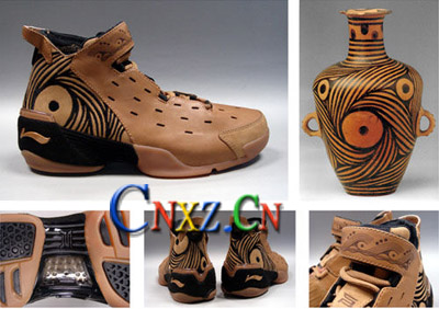 “半坡”其鞋,顧名思義。它的靈感來自中國仰韶文化體系中最具有代表性的陶器藝術品類型——半坡陶器。由于陶器的耐腐蝕性較強,雖然埋藏于地下數千年之久,但上面的刻繪圖案和文字雛形仍然清晰可辨,所以,一件陶器所蘊含的華夏文明積淀是既深厚又神秘的。設計師馬迅先生在發現了陶器身上所具備的文化感染力后,將具有代表性的半坡陶器與現代籃球鞋相結合,以李寧馭帥III為雛形,設計出此款“半坡”專業籃球鞋。