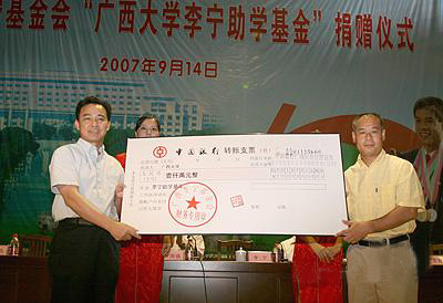 9月14日上午, “廣西大學李寧助學基金”捐贈儀式在廣西大學大禮堂隆重舉行。廣西李寧基金會向廣西大學捐贈1000萬元,以資助家庭貧困的廣西大學學子。李寧先生還承諾,出資在廣西大學校園運動場修建一條高等級塑膠跑道。