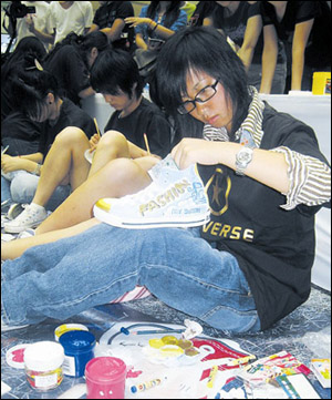 鞋帶上畫著碧綠的爬山虎,鞋幫上繪著抽象的黃鶴樓……昨日上午,銷品茂一樓涂鴉創作坊內,13名大學生席地而坐,在白色帆布鞋上繪上自己心中的圖畫。