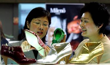 10月8日,在中國國際貿易中心,兩位女士在觀看鞋業博覽會上的展品。當日,第四屆中國國際鞋業博覽會在北京中國國際貿易中心開幕。展會吸引了國內外100多家知名品牌廠商參展。