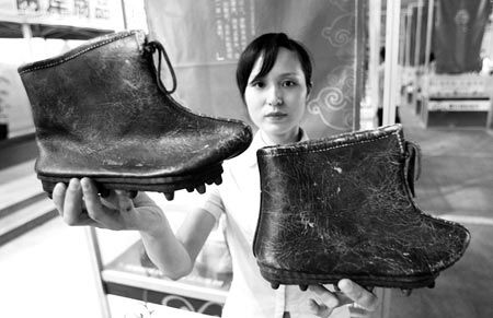 此外,還有新石器時期的“裹腳皮”,商周時期的辟邪玉雕鞋,戰國時期的銅靴鐓,明清兩代的三寸金蓮鞋、金蓮套靴等展出。