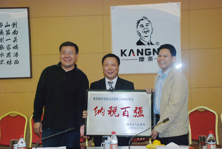 11月1日一大早,溫州市國稅局副局長徐利寧、地稅局副局長黃天志和鹿城區國稅局、地稅局的10多位領導便來到康奈集團,為該集團送來兩塊鐫刻著“2006溫州市納稅百強”和“2006年溫州市制造業50強”金字的牌匾。市、區兩級稅務局領導將牌匾鄭重交到康奈集團董事長鄭秀康手中,并對康奈集團在2006年度,對國家和地方財政所作的突出貢獻表示感謝和祝賀。