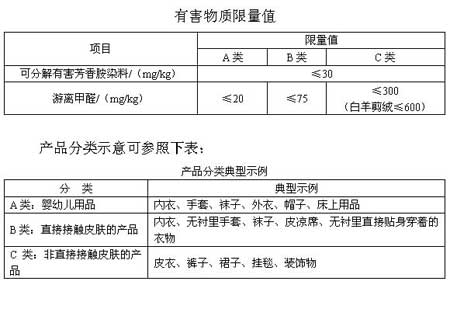 該標(biāo)準(zhǔn)根據(jù)皮革和毛皮的用途以及人的健康需要,將有害物質(zhì)可分解有害芳香胺染料和游離甲醛限量分為三個(gè)等級(jí),即:A類,嬰幼兒用品;B類,直接接觸皮膚的產(chǎn)品;C類,非直接接觸皮膚的產(chǎn)品。指標(biāo)如下: