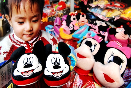 11月6日,一名小女孩正在銀川市新華商業街挑選老鼠造型的保暖鞋。2008年將迎來農歷鼠年,市場上各種“老鼠”題材的商品吸引了顧客的目光。新華社記者李紫恒攝