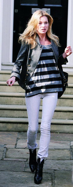緊身淺色仔褲與黑色尖頭皮靴又再度出場,橫條紋的寬身T恤在Kate Moss身上并不顯胖,圓領的西服式外套更是點睛之筆。Kate Moss永遠不會穿錯,這也是我們喜歡她的原因之一吧。