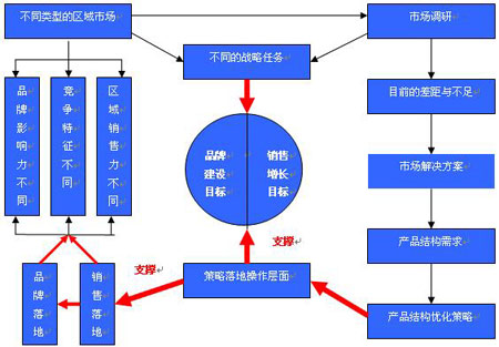 我們認為,企業在改變傳統戰略思考方式同時,應致力于解決區域市場實際問題,根據不同區域市場實際競爭狀況,確定不同的戰略任務,依此制訂不同的競爭策略,組成配稱的營銷系統,從而實現相應的銷售增長和品牌影響力提升的戰略目標,我們把戰略計劃用圖示進行分解,如圖二: