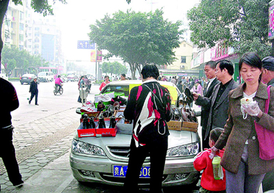 這輛小汽車的前后車窗都貼著一張寫著“處理60元”等字樣的黃紙。一打聽,原來是小汽車的主人將小汽車當作貨架銷售鞋子,每雙鞋子60元,小汽車的前后擺放著各種款式的男女皮鞋。小汽車主人說,鞋店用鞋子抵債,他們只好特價處理鞋子。由于沒有銷售皮鞋的場地,只好將皮鞋擺放在車身上出售。