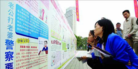 兩名女工通過(guò)現(xiàn)場(chǎng)的宣傳牌了解有關(guān)保護(hù)女性權(quán)益的規(guī)定
