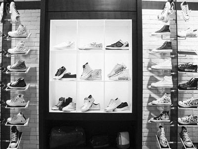 其中有閃亮奪目的“金銀鞋”、有鞋面記錄著“匡威”近百年歷史的經典休閑鞋,還有一上市就在香港賣得火熱的水印帆布鞋。店內不僅鞋款多樣,鞋帶的多種款式和系法也是一大亮點。例如用黑白兩種色調的鞋帶系鞋,還有用絲綢制作的鞋帶。