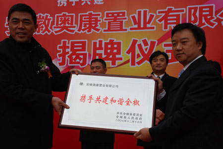 中共全椒縣委汪建中書記代表縣委、縣政府向安徽奧康置業有限公司贈送題寫“攜手共建,和諧全椒”的牌匾