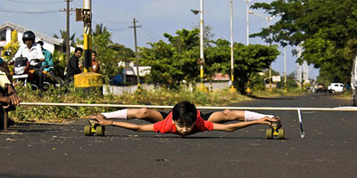 據測量,汽車底盤到地面的距離是20厘米,因此,鉆越汽車時,他要俯身貼地、將四肢伸展開之后才能順利鉆過汽車。最近,陳達克向記者透露了他是如何創下這項世界紀錄的。他說:“我是2年前在電視上首次看到一個女孩穿旱冰鞋從汽車底下滑過的,于是我決定自己嘗試一下。我花3個月時間才練好俯身的姿勢,之后我從許多汽車底下滑過,從來沒受傷。”