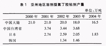溶劑型氯丁膠粘劑國內外的產量都在逐年減少(見表1),這很正常,因為被SBS膠粘劑和白乳膠代替了一部分。
