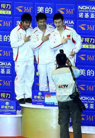 2008年1月9日晚,北京奧運會跳水選拔賽濟南站的比賽全部結束。在男子3米板決賽中,山東選手王峰憑借穩定的發揮以總成績542.55分摘得冠軍,廣東選手何沖總成績535.40分位列次席,秦凱則獲得了第三名,奧運冠軍彭勃最終名列第五。圖為比賽精彩瞬間。