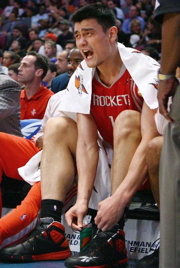 1月9日,火箭隊球員姚明在場下為隊友加油。當日,在NBA常規賽中,姚明率領休斯敦火箭隊客場以101比92戰勝紐約尼克斯隊。姚明奪得全場最高分36分。