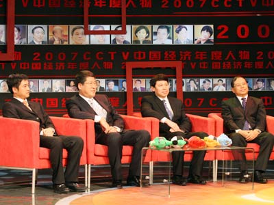 2008年1月15日CCTV《經濟半小時》特別節目——中國年度經濟人物評選“財富論道”在中央電視臺錄制。圖為節目現場嘉賓安踏鞋業集團董事長丁志忠(左一)、大連億達集團董事長兼大連軟件園股份有限公司總裁(左二)、皓月集團董事長叢連彪(左三)、天津港公司總裁于汝民(左四)。