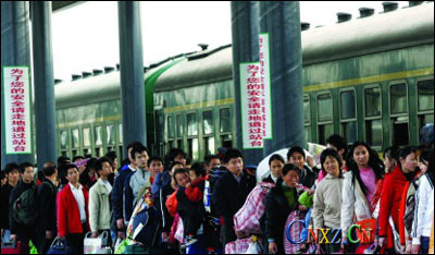 惠州火車站。東莞-鄭州的火車來了,農民工們井然有序地登上回家的列車。隨著傳統密集型產業在珠三角的撤離,昔日“世界工廠”的熱鬧場景和每年洶涌的民工潮或將成為歷史。本報記者田飛攝