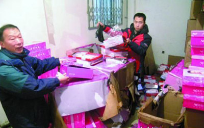 業戶們七嘴八舌向記者介紹了這里的情況。他們都是附近一家大型鞋城的業戶,在這里有三處地下室被當作存放鞋的倉庫。今日凌晨,其中一個地下室的供暖管線突然發生爆裂,大量暖氣熱水傾泄進地下室庫房內,積水在一個地下庫房內蔓延后,還向臨近的兩個大型庫房蔓延。在大家發現這里的情況后,立即找供熱部門來處理,跑水現象被控制住,但是這些貨物卻成了“水貨”。大家從清早一直忙碌到上午只搶運出其中一少部分。業戶們說,三個倉庫里存的鞋將近10萬雙,水淹造成的損失一時還無法統計。
