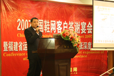 由中國鞋網(wǎng)主辦的“中國鞋網(wǎng)客戶答謝宴會暨福建省運(yùn)動鞋品牌戰(zhàn)略研究與市場擴(kuò)張深度交流會” 2008年1月25日下午在晉江寶龍酒店隆重舉行。會議邀請了晉江有關(guān)領(lǐng)導(dǎo)及各鞋業(yè)協(xié)會領(lǐng)導(dǎo)出席參加,共同探討地方鞋業(yè)發(fā)展政策和政府觀點的產(chǎn)業(yè)未來發(fā)展藍(lán)圖、鞋業(yè)產(chǎn)業(yè)的整體發(fā)展現(xiàn)狀和存在的現(xiàn)實及已經(jīng)進(jìn)行的對策和出路。