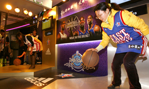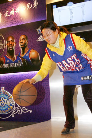 2月17日,兩位女球迷在挑戰(zhàn)無間斷運(yùn)球比賽。當(dāng)日,為了迎接08NBA全明星賽,由NBA官方體育用品全球合作伙伴阿迪達(dá)斯舉辦的"全明星無間斷運(yùn)球挑戰(zhàn)賽"在上海舉行。挑戰(zhàn)賽的賽制概念源于NBA全明星賽東、西部對抗的競賽傳統(tǒng)。參賽者可以自由選擇加入自己支持的分部,在限時5分鐘里,連續(xù)不間斷運(yùn)球數(shù)量最多者獲勝。此次挑戰(zhàn)賽旨在激起籃球愛好者們心中對于團(tuán)隊的忠誠和熱情,來支持自己喜愛的NBA籃球兄弟們。