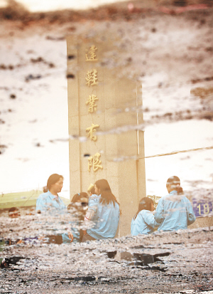為了省發千余工人少得可憐的年終獎,廣州鴻達鞋業有限公司把自己拖進了勞資糾紛的泥潭中。圖為擺工工人在一汪泥水中的倒影。時報記者 杜翠 攝時報訊 (記者 黃超)
