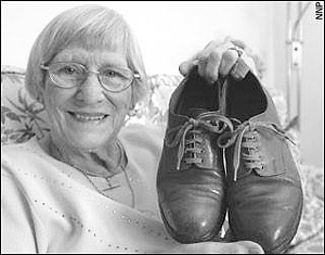 據《中國日報》報道現年87歲的英國老太凱瑟琳.杜德曾是一名二戰(zhàn)女兵,1941年,她從部隊領到一雙軍用皮鞋。從此,這雙做工結實的軍鞋陪伴著主人走過了67個冬夏。日前,凱瑟琳依依不舍地將這雙穿了67年的“老伙計”捐贈給了當地博物館。