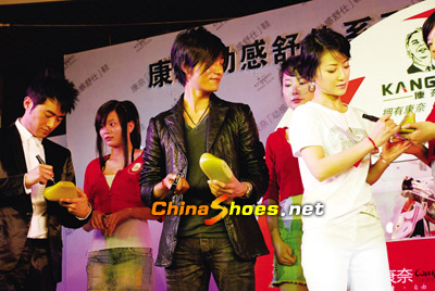 為了開拓市場,溫州鞋企各顯神通。康奈將為100位國內外知名人物制作鞋楦數據庫,圖為陳坤、陳紫涵在自己的鞋楦上簽字留念。