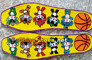 謀水:做鞋墊的三姨說,她們全家都很喜歡看姚明的籃球比賽。我三姨做鞋墊有20多年的經驗,因為注重鞋墊花樣,在當地很有名氣。做好的也都分送給了親友,我得到了一雙戲曲臉譜的鞋墊(如圖2),如今當成民間藝術品收藏了。