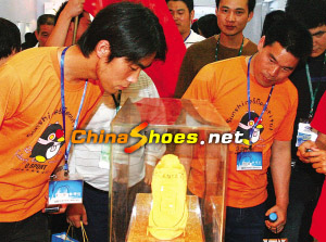 而在展區中央的墻壁上,“奧運喜攀登”5個大字讓人一目了然。“這里的奧運氣氛最濃,那雙紅色的奧運足球鞋做得很好,是我今天看到的最具奧運色彩的鞋子。”晉江人顏偉群如獲至寶地告訴記者,到鞋博會,就是想找出一雙以奧運會為主題的鞋子,而這一雙名副其實。對于顏偉群的觀點,“看鞋團”的多數成員表示贊同,認為喜攀登的鞋子走在了時代的前沿,做得很聰明。