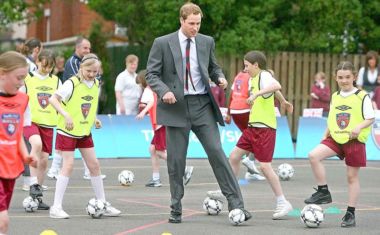 5月9日,威廉王子到英國西北部城市布萊克本的圣艾丹學校觀看英國足球協會的技術訓練課程。視察時,威廉王子來到球場秀起了球技,或許是沒有準備,威廉王子穿著一身名牌西裝和高雅皮鞋就上了球場。Britain’s Prince Wiliam (C) plays footbal with children from St Aidan’s Primary School in Blackburn, northwest England, on May 09, 2008. As patron of the English Footbal Association, (FA) the prince was visiting the school to see children taking part in the FA Skils Programme.