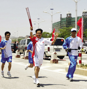第15棒、來自福建省體工隊的帥哥陳金森一起跑就引起了陣陣尖叫,不僅是因為帥哥與生俱來的吸引力,還因為其獨特的“舞步”,“一、二、三、跳,一、二、三,再跳”,陳金森幾乎是跳完200米的,用肢體語言來告訴全場的觀眾,“我是個三級跳運動員”,也讓在場的所有市民明白,圣火可以傳遞,激情可以感染,陳金森不斷地跳躍,不斷地吶喊,用運動員獨特的魅力讓全場的氣氛都High到了極點,連兩名護跑手都情不自禁地上前一起握著“祥云”奔跑。