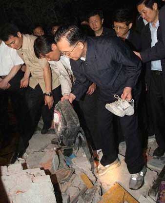 溫家寶總理廢墟中撿起學(xué)生的鞋子