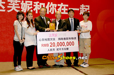 5月15日,當(dāng)各界愛(ài)心持續(xù)關(guān)注地震災(zāi)區(qū)之際,亞洲知名女鞋品牌達(dá)芙妮在上海召開(kāi)新聞發(fā)布會(huì),宣布向四川汶川地震災(zāi)區(qū)捐出總計(jì)2000萬(wàn)元人民幣的錢款及物資。達(dá)芙妮品牌代言人劉若英透過(guò)電話聯(lián)機(jī)呼吁各界一起奉獻(xiàn)愛(ài)心,S.H.E 更是特別出席發(fā)布會(huì)并代表企業(yè)進(jìn)行捐贈(zèng)。上海慈善基金會(huì)代表災(zāi)區(qū)接受了這一項(xiàng)捐贈(zèng),達(dá)芙妮希望能夠透過(guò)這項(xiàng)舉動(dòng)拋磚引玉,號(hào)召更多人奉獻(xiàn)愛(ài)心幫助災(zāi)區(qū)的民眾。