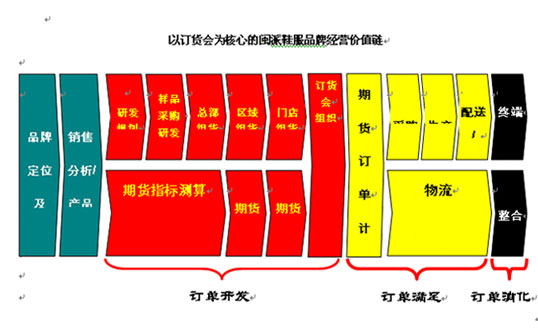 同時不得不提的是,目前絕大部分的閩派男裝品牌,其自身的定位還是產品制造商。在供應鏈整體運作價值鏈各個環節,均存在難以跨越的陷阱:(一)研發組貨環節——在商品企劃、研發設計和總部組貨上的能力都較弱;(二)訂貨會環節——企業最為關鍵的業務活動,一切圍繞每年2-4次訂貨會運轉;(三)采購生產環節——企業第二關鍵的業務活動,無法準時交貨,再多的訂貨會期貨訂單也是空中樓閣;(四)配送分銷環節——依托第三方物流但又缺失對其必要的掌控,使供應鏈在分銷環節幾乎是斷裂的;(五)終端銷售環節——單純的廣告傳播效應,難以長期支持品牌的健康發展。