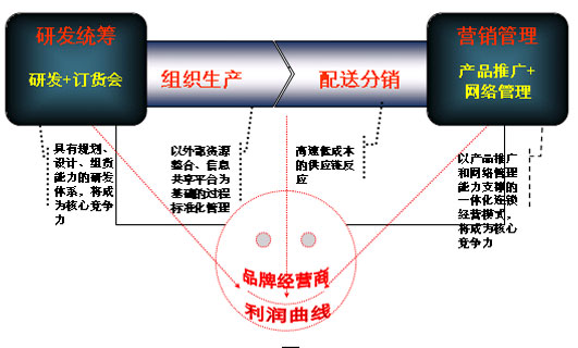 任何行業都存在利潤區不斷漂移現象,鞋服行業同樣不例外。目前鞋服行業的利潤區正在加速“飄離”生產制造環節,并加快向上游研發環節和下游營銷環節的“漂移”過程,著名的“微笑曲線”理論已經形象說明這一點(如下圖1)。科學地預見和把握利潤區漂移的行業發展契機,先知先覺地找到并成功切入到利潤豐厚的價值鏈環節,對于鞋服行業經營模式創新至為關鍵。依托“輕資產”的虛擬經營模式,實現職能定位從產品制造商向品牌運營商的邁進、組織架構從“紡錘型”向“啞鈴型”過渡,是閩派鞋服品牌目前現實而迫切的需求。美特•斯邦威的發展奇跡已經為中國的服飾品牌真實演繹了一幕品牌運營商的快速成功之路。