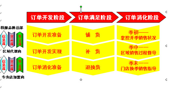 閩派鞋服品牌特許經營作業關系圖涉及三個作業重點,從作業主體上涵蓋鞋服品牌總部-區域代理商-專賣店加盟商三個層級,從作業階段上銜接訂單開發階段-訂單滿足階段-訂單消化階段,從作業內容上貫通信息流-貨品流-資金流。