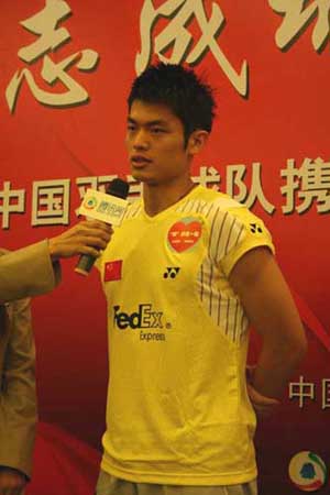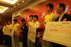 22日下午,北京天壇飯店,由中國羽協、中國羽毛球隊攜手中國隊長期合作伙伴發起的賑災捐助儀式隆重舉行。剛剛在今年湯尤杯賽上實現尤杯六連冠、湯杯三連冠壯舉的中國軍團,現場捐出了四枚湯尤杯冠軍金牌,與361°等眾多合作伙伴一起,共為四川地震災區籌得善款400萬,并當場交由中國紅十字基金會轉交給災區人民。